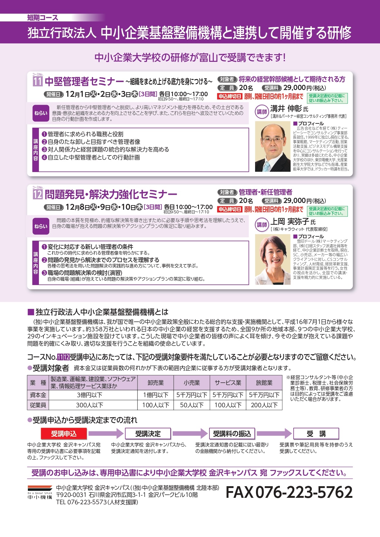 富山県の委託を受け、富山県商工会連合会では、とやま中小企業人材育成カレッジを開講し、中小企業の経営者、管理者、スタッフ等の方々を対象とした人材育成研修事業を実施しています。全国で9校の「中小企業大学校」を展開している(独)中小企業基盤整備機構(中小企業大学校 金沢キャンパス)と連携し、ハイレベルな研修・ゼミナールを富山で提供いたしますので、ぜひ、ご活用を検討ください。