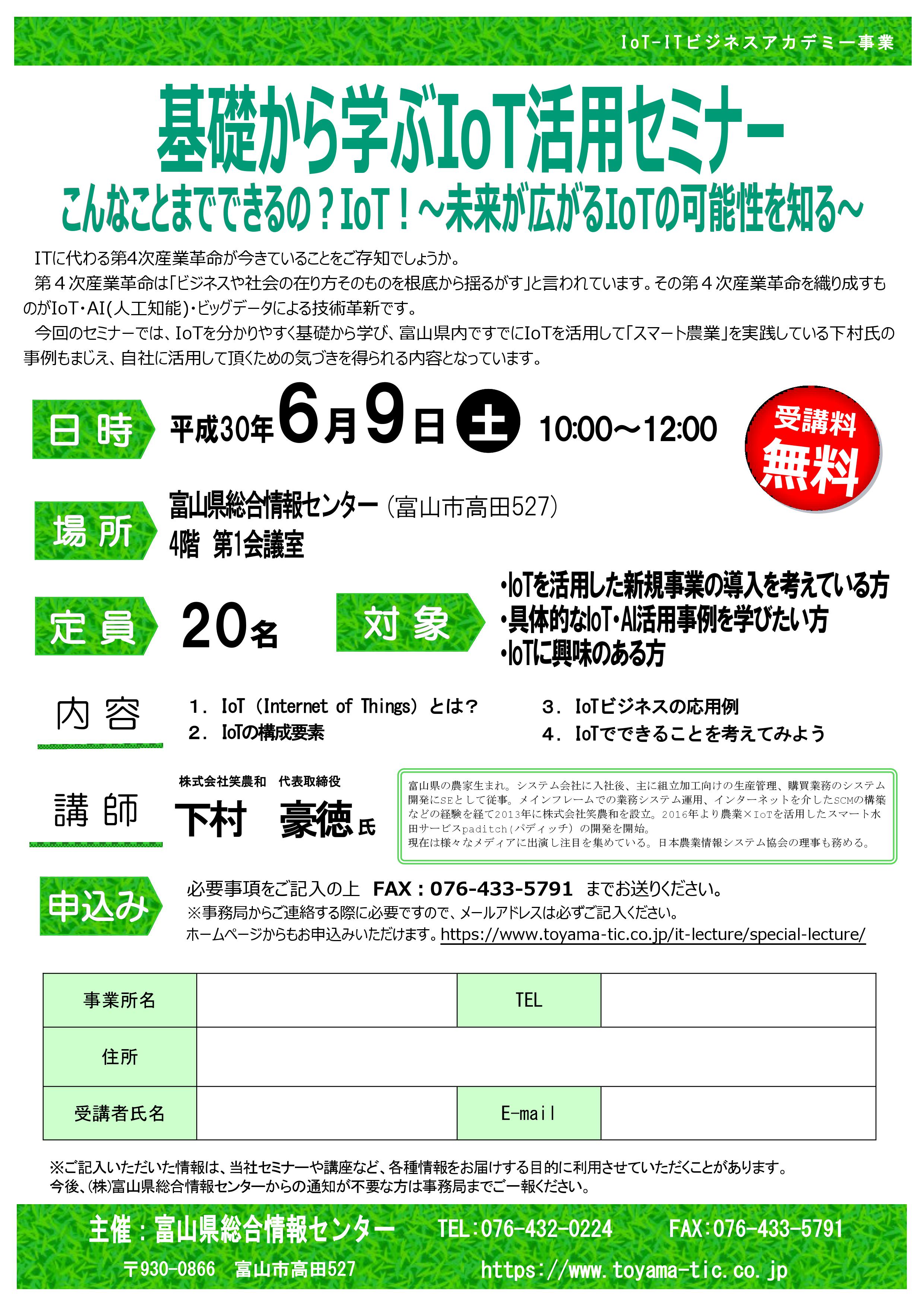 今回のセミナーでは、IoTを分かりやすく基礎から学ぶほか、富山県内ですでにIoTを活用して「スマート農業」を実践している下村氏の事例もまじえ、自社に活用して頂くための気づきを得られる内容となっています。
