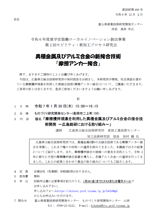 異種金属及びアルミ合金の新接合技術「摩擦アンカー接合」セミナー