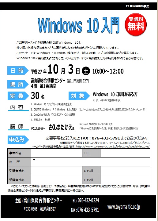 使い慣れた操作感のままでさらに高性能になった新機能がたくさん搭載されています。このセミナーではWindows 10の特徴、操作方法、新しい機能、アプリの活用法などを解説します。