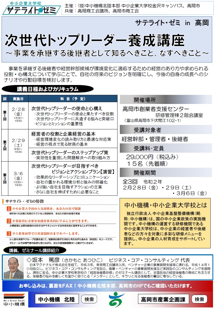 高岡市及び独立行政法人中小企業基盤整備機構北陸本部(以下、「中小機構」と標記)は、事業承継をテーマとした「中小企業大学校サテライト・ゼミ in 高岡」の参加者の募集を開始します。今回は、ビジネス・コア・コンサルティング代表の坂本篤彦氏を講師にお招きし、後継者等が今後の環境変化に適応するための経営のあり方や求められる役割・心構えについて学ぶことで、自社の将来ビジョンを明確にし、今後の自信の成長へのシナリオや行動目標を検討します。
